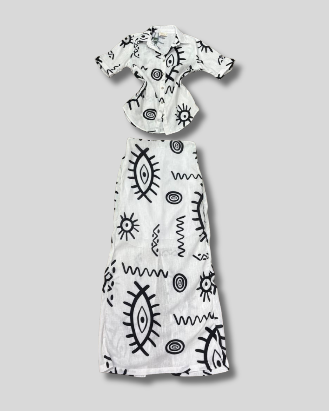 Conjunto colombiano de falda larga y camisa de ojos turcos